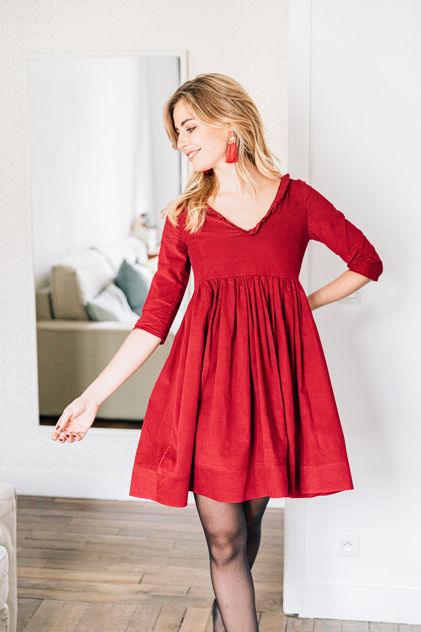 • Mannequin portant notre robe en velours de coton rouge, coupe large, manches 3/4. Robe portée en pleine lumière naturelle.